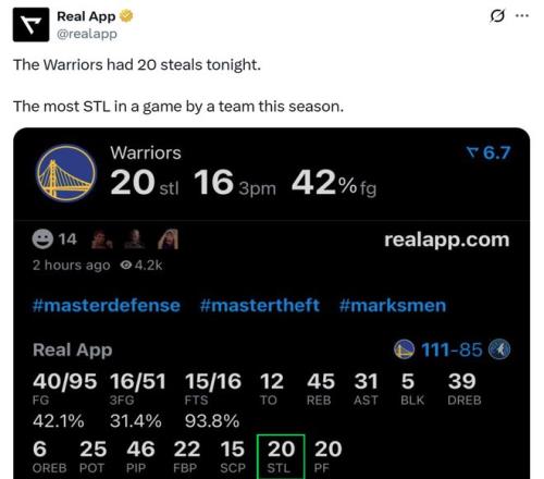 全场勇士队一共送出多达20次抢断,创造本赛季单场新高,其中首发库里与波杰均送出4次抢断,理查兹3次、追梦与桑托斯2次、霍福德、梅尔顿、波斯特、TJD、斯宾塞均有1次入账。