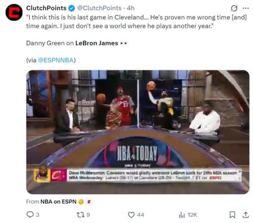 勒布朗的前队友丹尼-格林在ESPN的节目中时说道:我觉得这场比赛是詹姆斯在克利夫兰的最后一场比赛了。他之前一次又一次证明我的分析的错的,可这次我实在是想象不到勒布朗还能再打一年的情景,毕竟他已经41岁了。