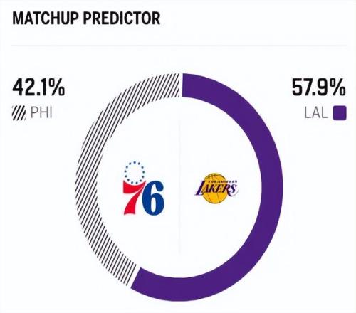 赛前,美媒ESPN对本场比赛进行了胜率预测,湖人队胜率高达57.9% ,76人胜率则仅有42.1% ,劣势明显。