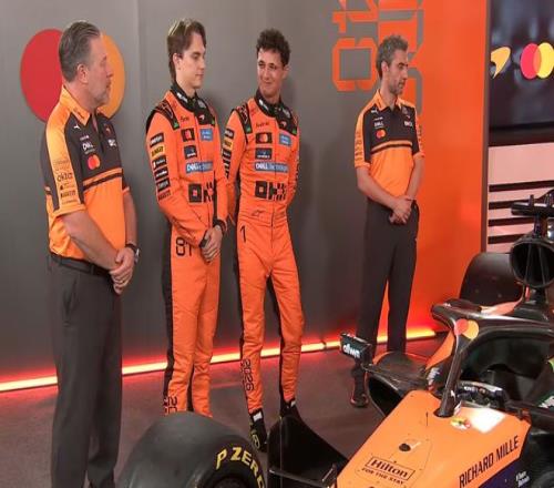 两位车手,兰多·诺里斯与奥斯卡·皮亚斯特里,以及车队负责人安德里亚·斯特拉与首席执行官扎克·布朗共同出席了发布会。