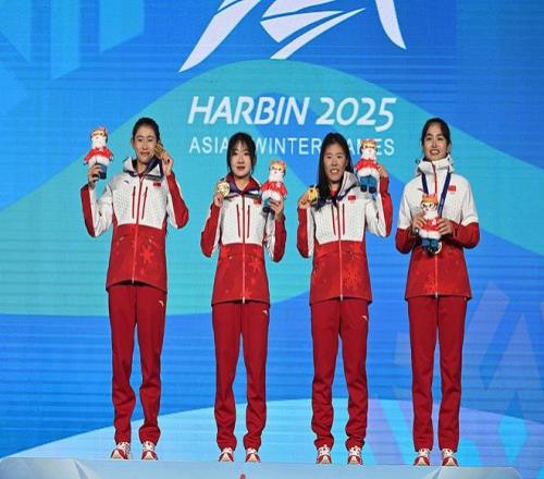 2025年2月12日,在哈尔滨亚冬会越野滑雪女子4×5公里接力决赛中,由李磊、池春雪、陈玲双、迪妮格尔·衣拉木江组成的中国队夺冠。中新社记者 刘文华 摄。c