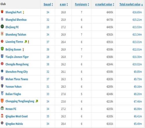在中超球队里,两支青岛球队的身价排名垫底,青岛西海岸为641万欧元,青岛海牛则只有549万欧元,是唯一一支身价没有超过600万的中超球队。