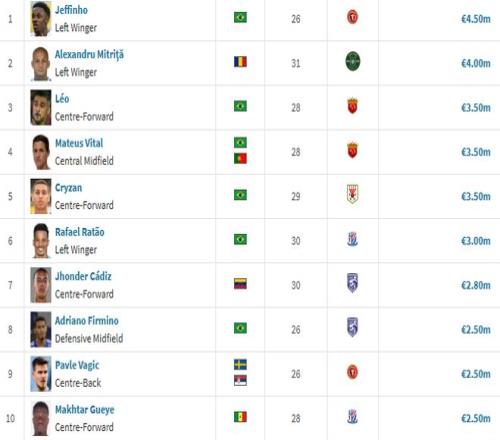 升班马辽宁铁人则以1301万欧元排名第5位,热菲尼奥以450万欧元的身价成为中超身价最高的球员,力压米特里策(400万)以及身价达到350万的维塔尔、克雷桑、莱昂纳多。