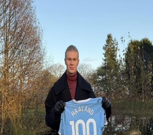 哈兰德晒出英超100球纪念球衣,这画质都快看不清哈兰德的脸了 -